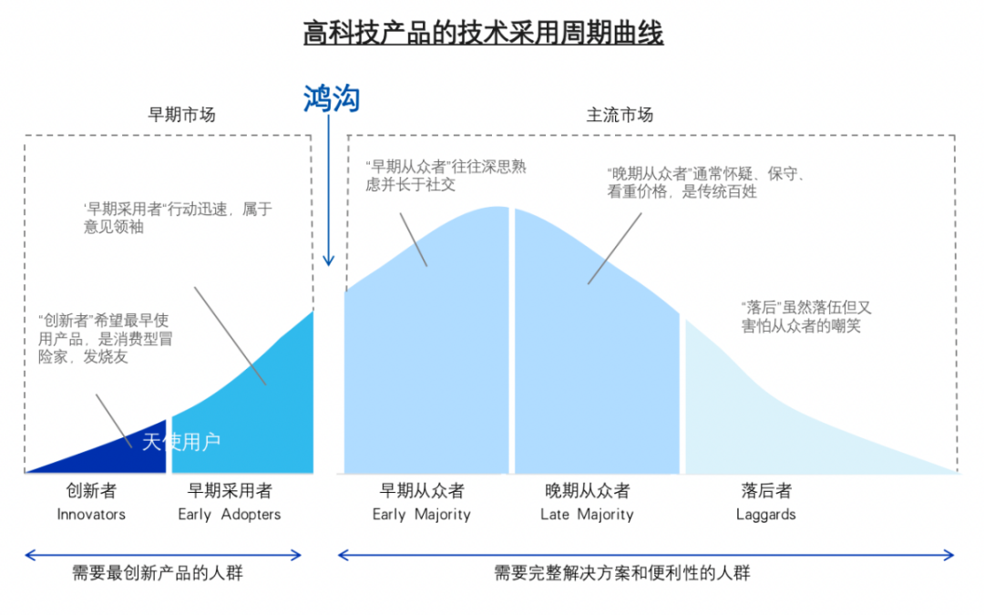 这个模型将市场分为早期市场和主流市场,其中,占据着早期市场的是创新者和早期采用者,他们往往被称为天使用户。随着高科技产品进入到主流市场,逐渐会与早期市场之间出现一条存在着严重“分裂”的「鸿沟」,而归属于主流市场的人群则是早期从众者(Early Majority)、晚期从众者(Late Majority)以及落后者(Laggards)。