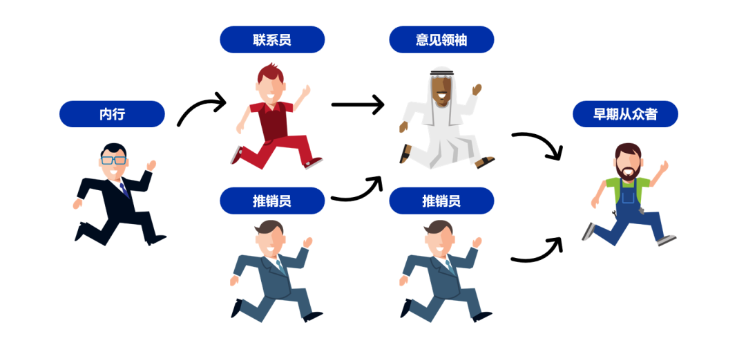 一般来说,以上五种策略都发生在企业或者商家与顾客的直接沟通中,这往往是通过大众媒体来传播,如今广告充斥,交智商税的产品满天飞,这种传播方式的可信度大大降低,尤其是对于主流市场中的人群,他们本身就是谨慎的怀疑者,以这种方式与他们沟通,仍然不足以跨越鸿沟。因此我们还需要考虑到跨越鸿沟的另一重要路径是:找到关键人物,从大众传播转向人际沟通。我们需要认识以下几类人: