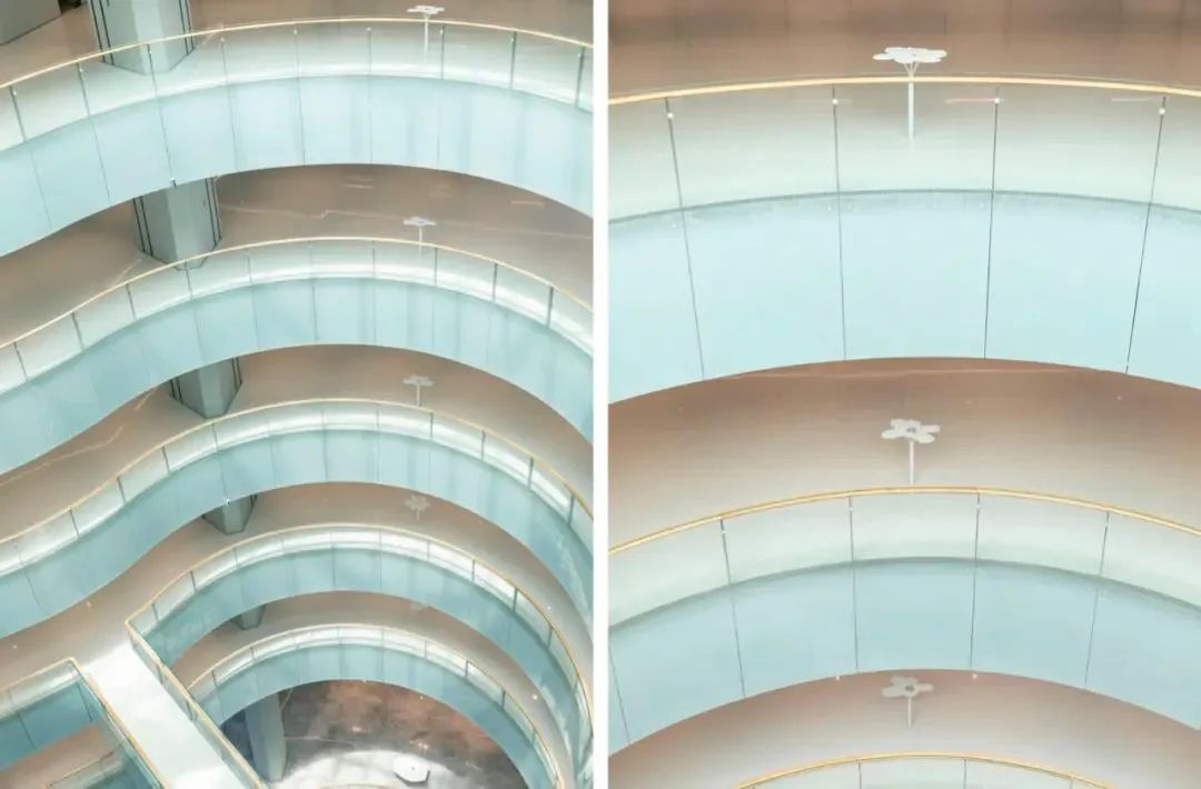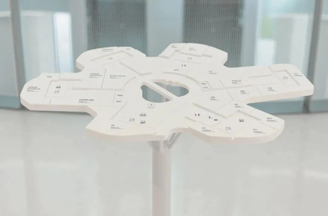 这些设计都有着原研哉一贯的极简风格,最让圈主喜欢的其实是这个花型导视标志,上面有室内建筑的标志,方便大家寻找方位和认清标志。