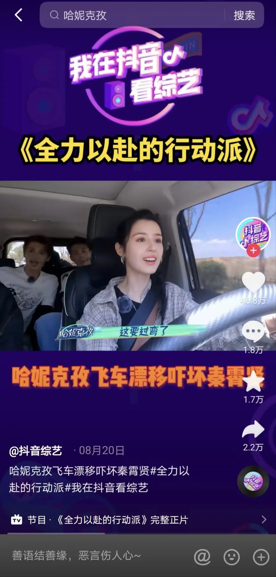 《全力以赴的行动派》独具短视频生态优势,节目中丰富的物料借助抖音的流量生态,精准投递到观众面前。向全域投放大量的花絮,以及玩家们的精彩瞬间,不断为节目引流。全网热门短视频如哈妮与黄明昊打高尔夫球、哈妮飞车漂移吓坏秦霄贤等,引发网友高度关注。