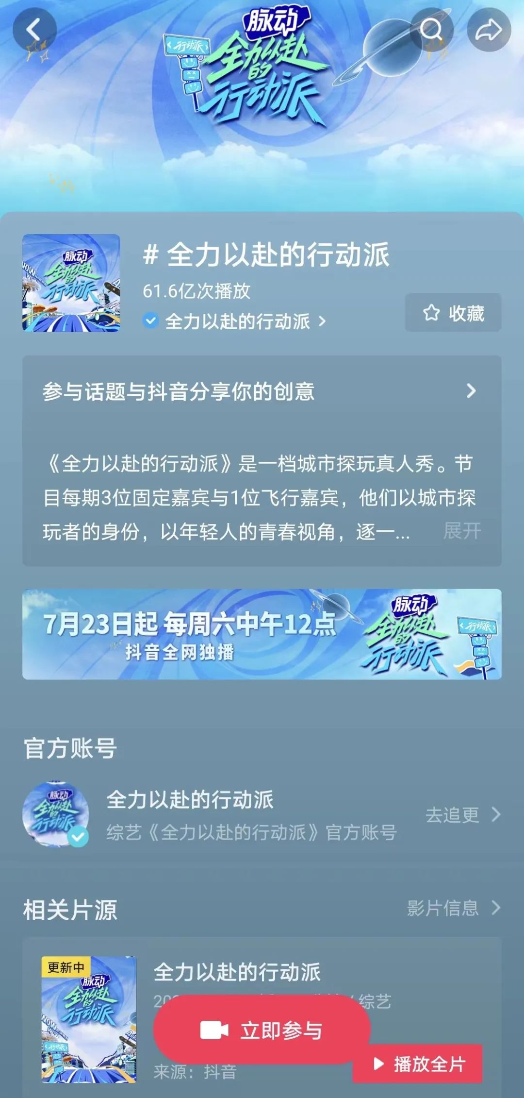 深入探究,发现是抖音联合脉动推出:全新探玩类综艺《全力以赴的行动派》,该节目由抖音和日月星光出品,克果传媒联合出品,日月星光承制。抖音全网独播。在年轻行动派嘉宾的带领下,穿越不同的城市,迎接各种未知的挑战任务,用非常态的新鲜玩法,发掘当地的潮流活力。