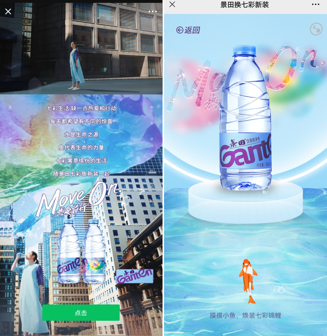 当用户通过摸摸小鱼就能唤醒景田的七彩新包装,较低的参与门槛和开盲盒式的惊喜体验,提升景田此次焕新活动社交曝光的同时,也进一步加深品牌好感度,助力品牌理念更好表达。