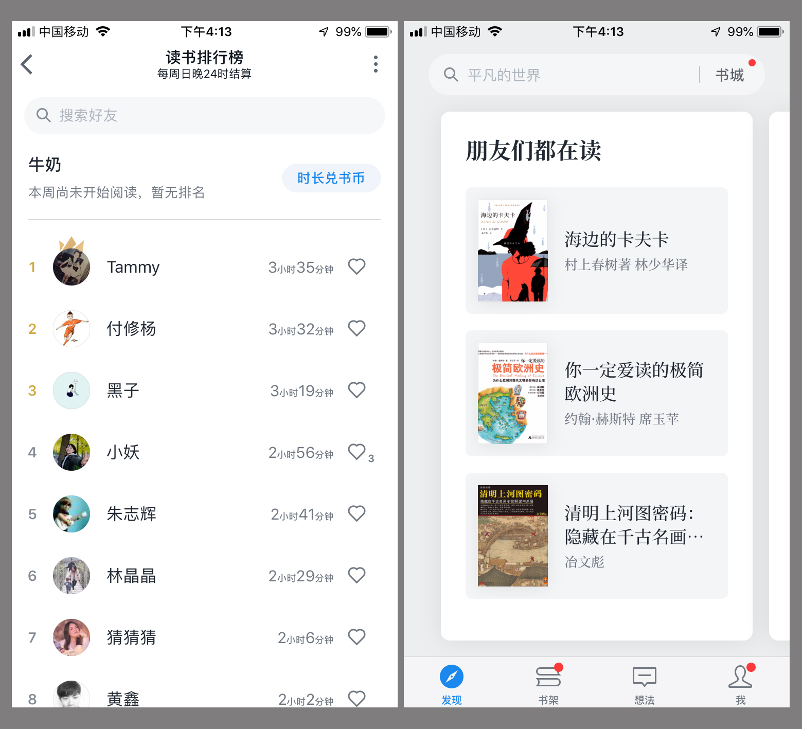 通过朋友在读和好友排行榜,满足了人们的社交需求和自我实现需求。