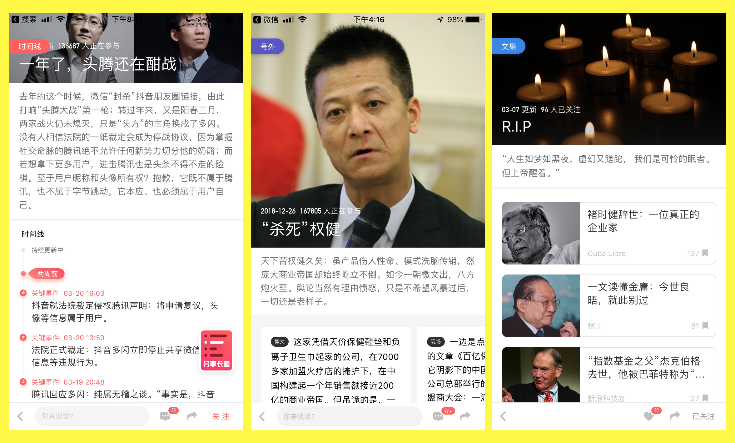 时间线是针对一些热点、观点、痛点进行持续性的跟踪报道;号外和文集分别是对某一事件和某一主体的文章集合。通过不同的内容满足不同的需求。
