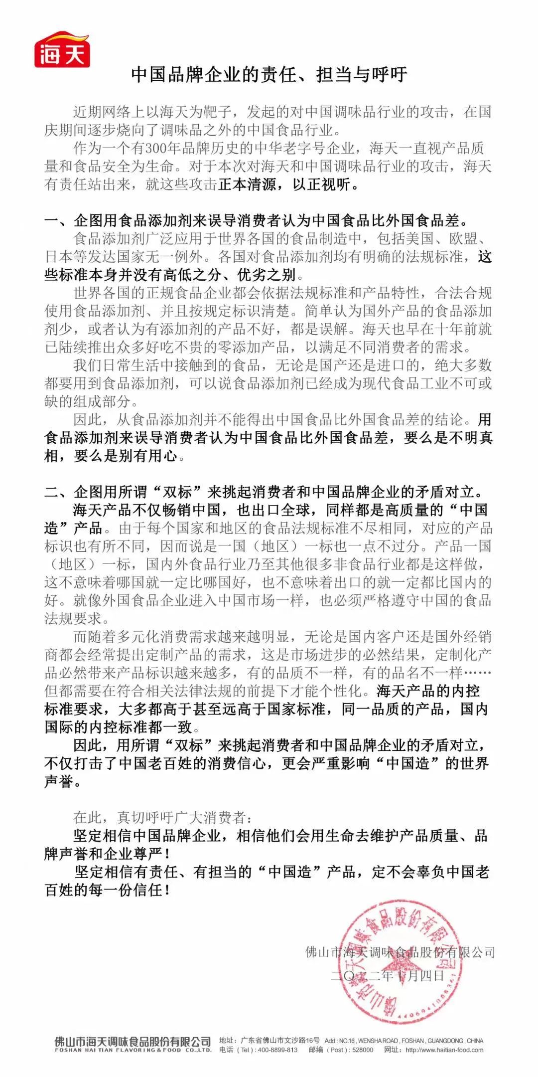 对于此,海天酱油紧急回应,表示「所有产品符合国家标准」,随着事件的持续升温,海天再次发布了关于“双标”的回应,直言“国内外酱油内控标准无高低之分,优劣之别”,同时得到了中国调味品协会的力挺并支持海天酱油「依法维权」,而中国调味品协会的支持似乎是提油救火,激起了大众的情绪,有人甚至将天海酱油倒进了水槽。一方面是消费者对添加剂的担忧,另一方面是更多人认为企业没有温度感。