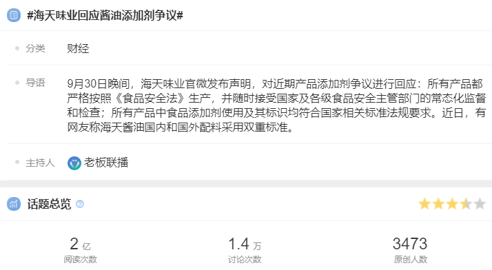 截至发稿前,#海天味业回应酱油添加剂争议#话题阅读已经超过了2亿,话题讨论超过了1.4万。