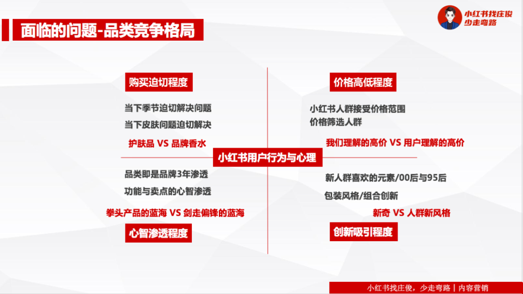 按照我们第一条的竞争格局上来看,这个品类究竟适合抖音多一些,还是适合小红书多一些、应该投入多少费用,占比是多少,自己组建团队来做,还是外包给服务商来做(具体的内容,庄俊会在《竞争拼图思维》谈到)。