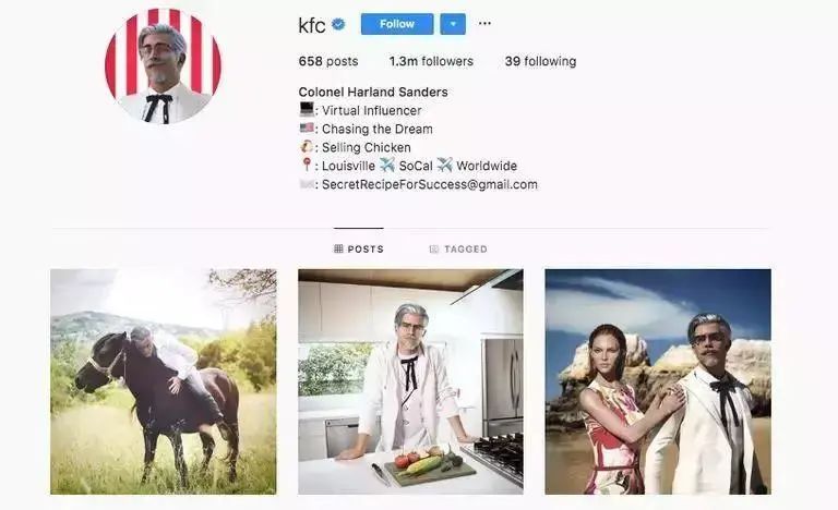 角色设定变了,那么围绕角色出现的场景和呈现的生活方式也发生了巨大变化。在推出新的上校形象后,肯德基也开始在INS上晒出他的日常:出入健身房、骑马、在头等舱品红酒;