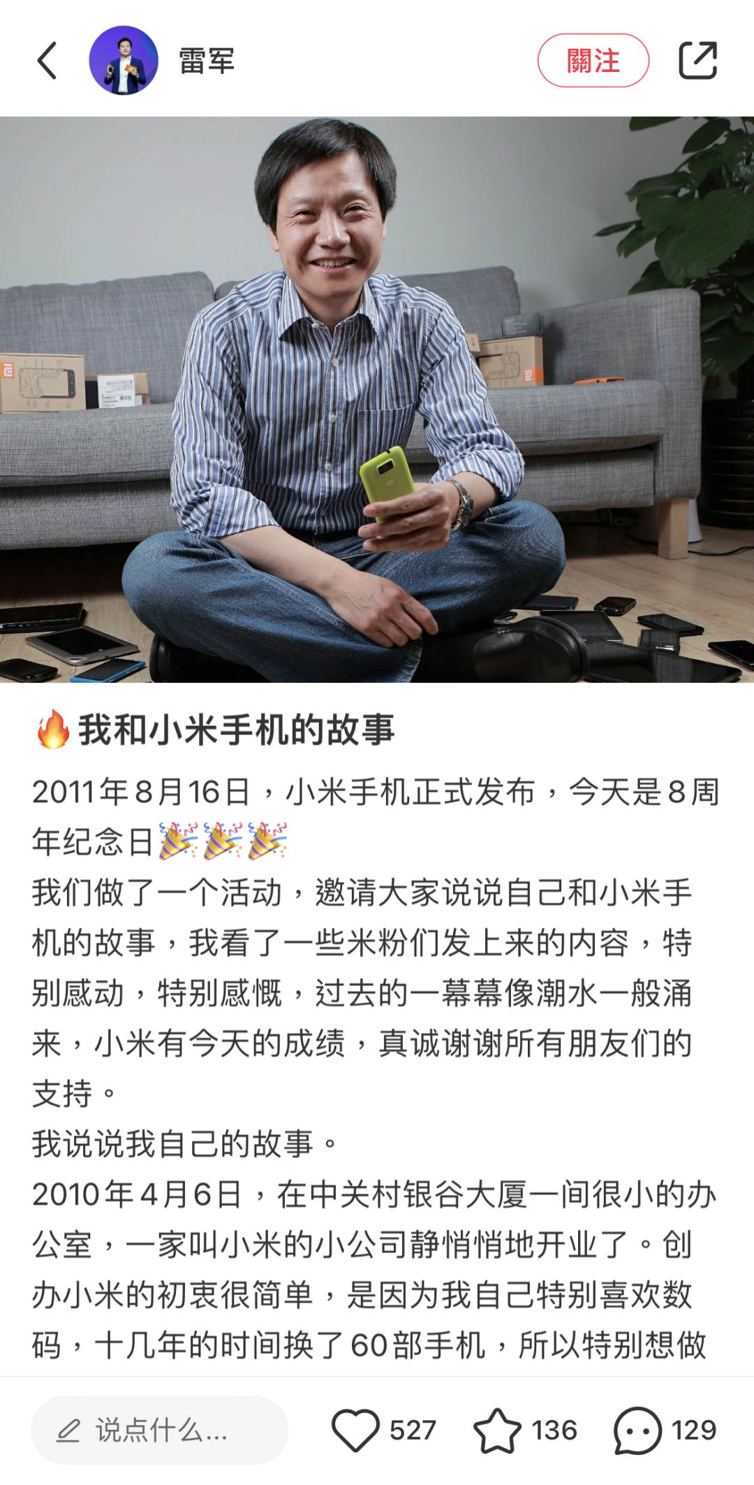 小米围绕雷军个人打造了自媒体矩阵,并衍生出了极其丰富的内容。雷总有自己的微博账号、公众号、知乎号、小红书号、抖音号、B站号、视频号,分享大量的日常生活、演讲视频、产品测评,乃至段子、自拍等。