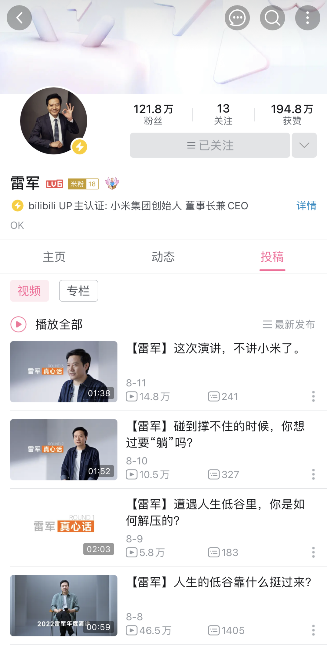 而在小米公司的企业账号,还有《雷军真心话》《雷军请你超大杯》等专辑内容,以及官方恶搞鬼畜的R U OK、雷总唱过的歌、雷总教你读古诗、雷总教你科学化妆等内容。