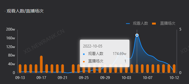 据新抖数据显示,汇源直播间的观看人数在10月5日实现了暴增,品牌直播观看人数超过了174万。