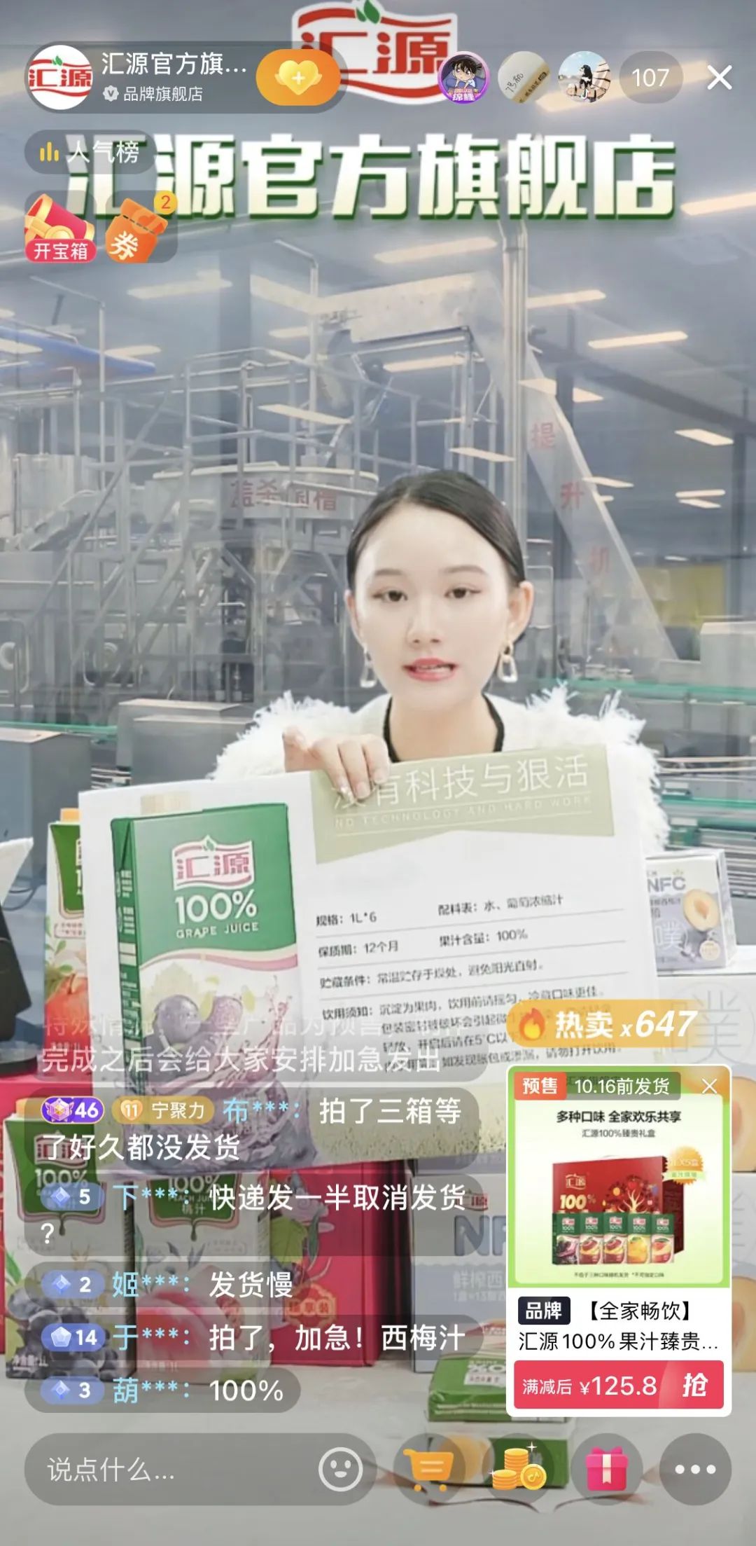随着网络上关于「科技与狠活」消息的发酵,也让更多的消费者迅速涌入汇源果汁的直播间,良性品牌、有责任的企业等好评纷至沓来,消费者也通过购买、观看直播等方式去支持品牌,也让汇源品牌的热度在短时间内实现了显著的提升,在消费市场掀起了野性消费风潮。