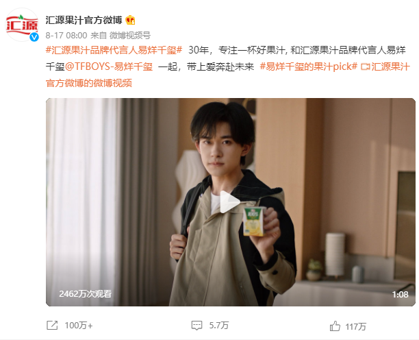 在代言人的选择上,汇源果汁则签约了现在炙手可热的95后艺人易烊千玺作为品牌代言人,而引来了超高的关注,其官宣微博的点赞与转发均为100万+。而易烊千玺的粉丝基本上为爱美的女性,其年龄大多数集中在18-24岁,这部分人群更容易接受新鲜事物,并对市场热点保持着浓厚的兴趣。粉丝年龄偏年轻化,也对汇源果汁提出了更高的要求。