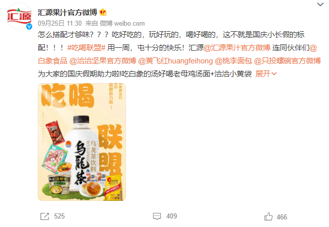 在吃等于减压的年轻化语境下,汇源果汁更是与白象、桃李面包、黄飞鸿、洽洽、只投螺碗等品牌组合成了「吃喝联盟」,来满足年轻人“吃得快乐、喝得舒爽”的消费需求,给年轻人的小长假提供了快乐的标配,并顺势帮消费者解决了怎么吃才够味的烦恼。