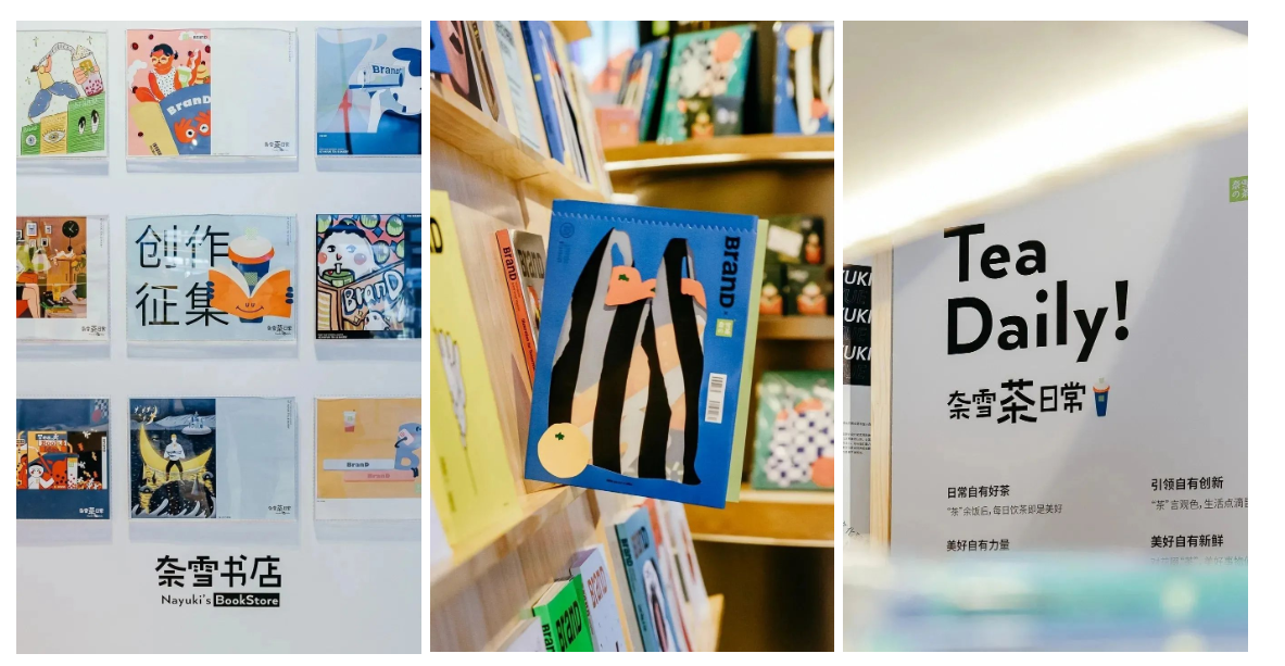 11月,奈雪与全球知名品牌设计杂志《BranD》推出了一期联名杂志,内藏一本名为《Nayuki'sTea Daily》(奈雪茶日常)的小册子,分享茶的历史、文化与艺术。奈雪还将书店搬到了门店内,打造了一个限时的奈雪联名杂志区。