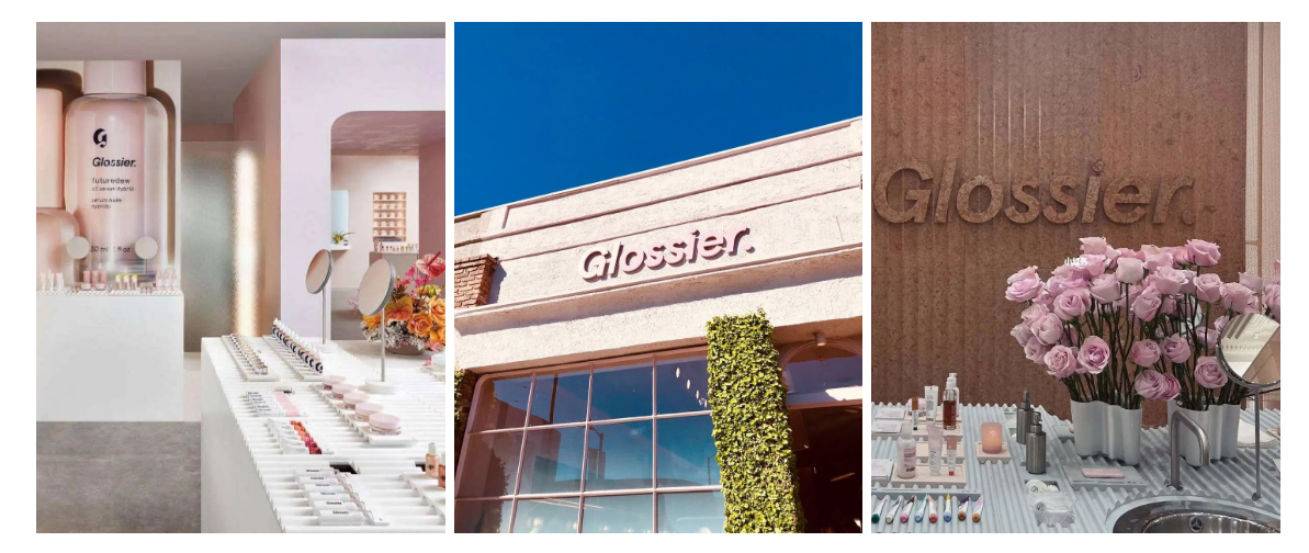 2016年,Glossier将纽约的旧办公室改造成了第一家店面,店内统一采用品牌专用色Glossier Pink,有粉色石膏墙、粉色陈列柜、红色台阶、红色真皮沙发等,整个店无一不粉。