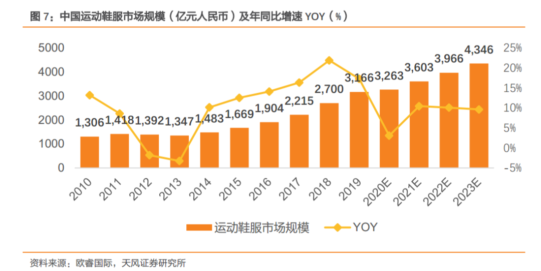 伴随着国内人均收入水平的稳步提升,体育运动市场规模步入高景气度快车道,欧睿国际数据显示,我国 2023 年运动鞋服市场规模有望达到 4346 亿元。
