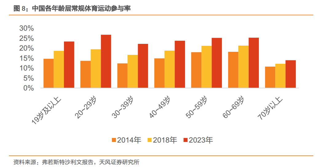 中国各年龄段人群体育运动参与度均处于高速上升阶段,其中20~29 岁年龄阶层提升最为明显,年轻人群将成为国内体育运动市场增量重要来源之一 。
