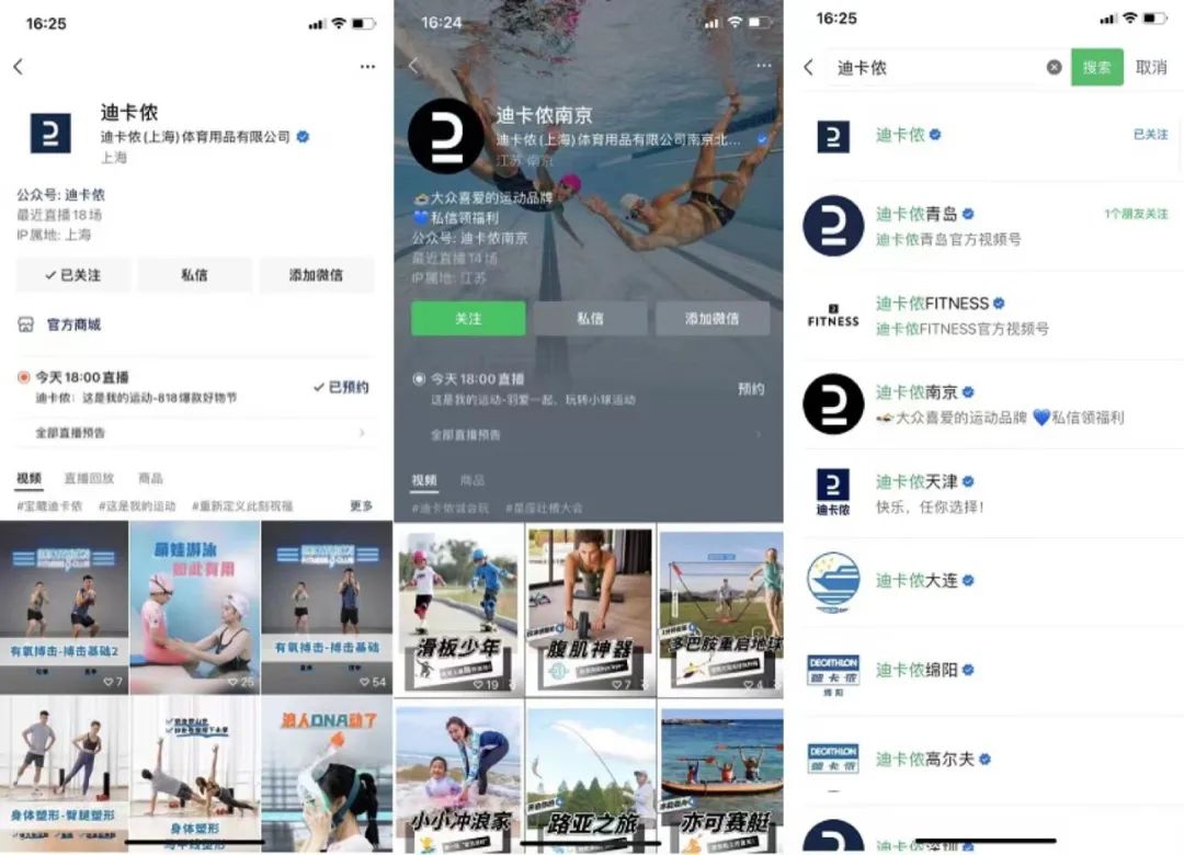 其他为地方城市视频号,如:迪卡侬南京、迪卡侬青岛、迪卡侬深圳、迪卡侬北京等。矩阵号只有个别区域如南京有直播,其他未见有直播预告。