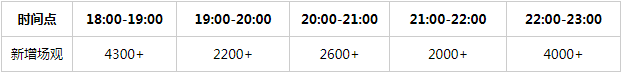 前一小时的场观数据最大,原因为预约直播间的用户在开播时大量涌入,而后每小时新增场馆维持稳定的2000+。