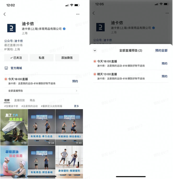 迪卡侬视频号主页做了【直播预约】和【添加微信】的入口,为下一次开播的用户倒流和用户留存做好准备。