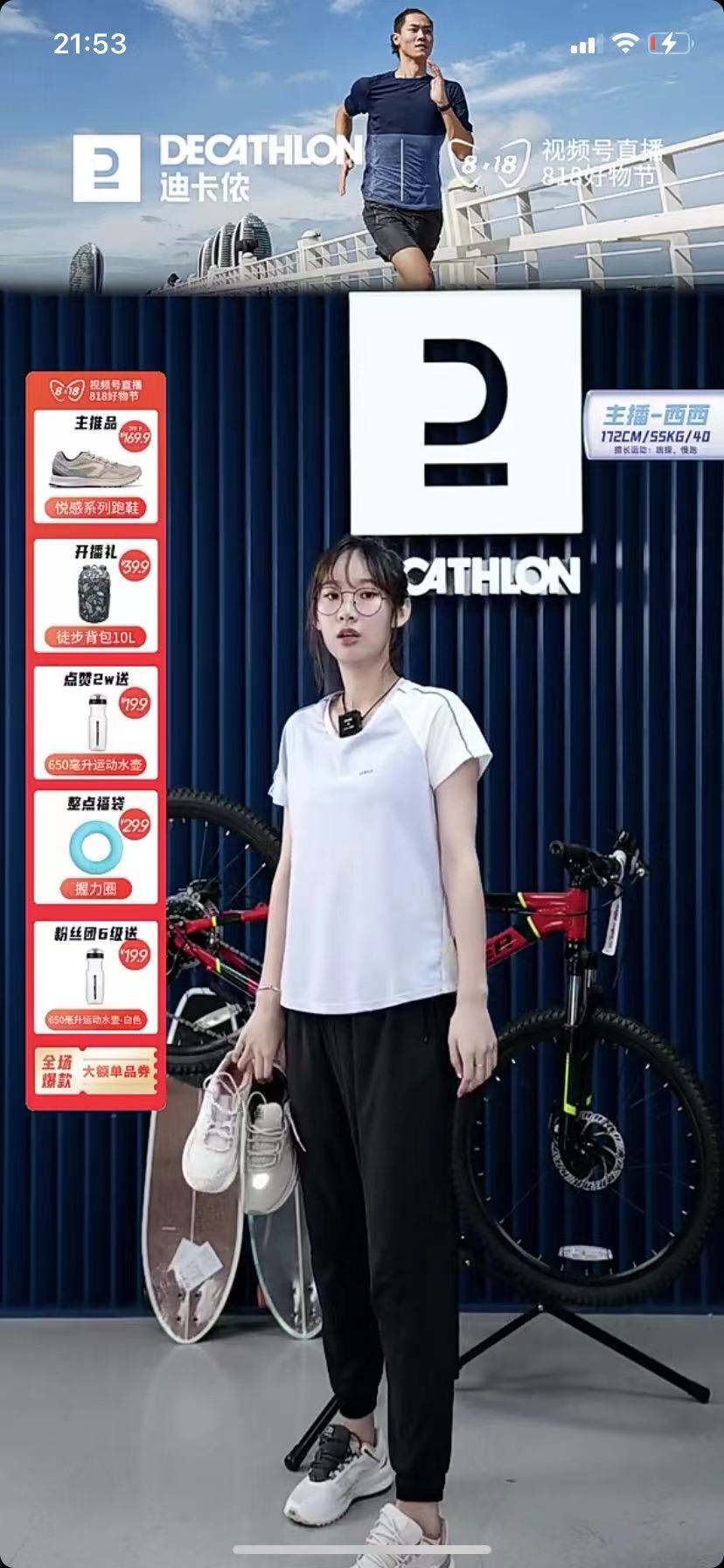 直播间背景仅仅有自行车和滑板,较为简陋,和迪卡侬卖场的氛围感相距甚远,直播间场景的搭建不太有想要运动的感觉。