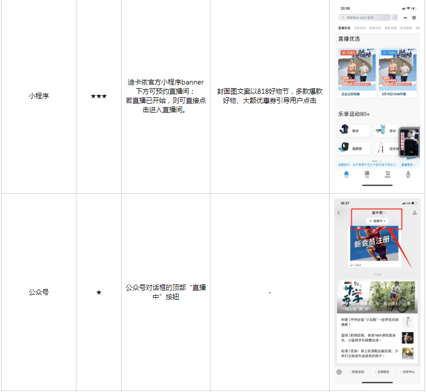 - 小程序:迪卡侬Decathlon(定位线上商城、做销量转化)、迪卡侬会员俱乐部(定位会员体系、积分权益、会员活动等维护广大会员)