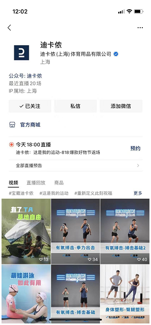 - 视频号:视频号矩阵包括主号迪卡侬和地方城市账号