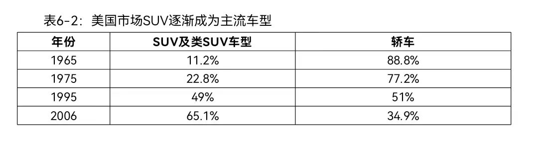 里斯公司在给长城汽车做咨询时,给出了美国市场SUV车型从边缘成为主流的数据。从1965年到2006年的40年间,SUV车型从11%增长到65%。