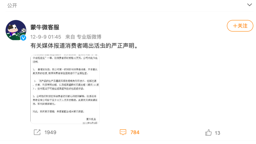在蒙牛声誉不太好的那几年,曾有人在微博上晒出在蒙牛的奶中喝出活虫,被网络转发好几万。理性来看,现代的食品工业,高温杀菌,真空包装,不大可能出现活虫,因而蒙牛也做了声明,但这个声明仅仅转发几千。