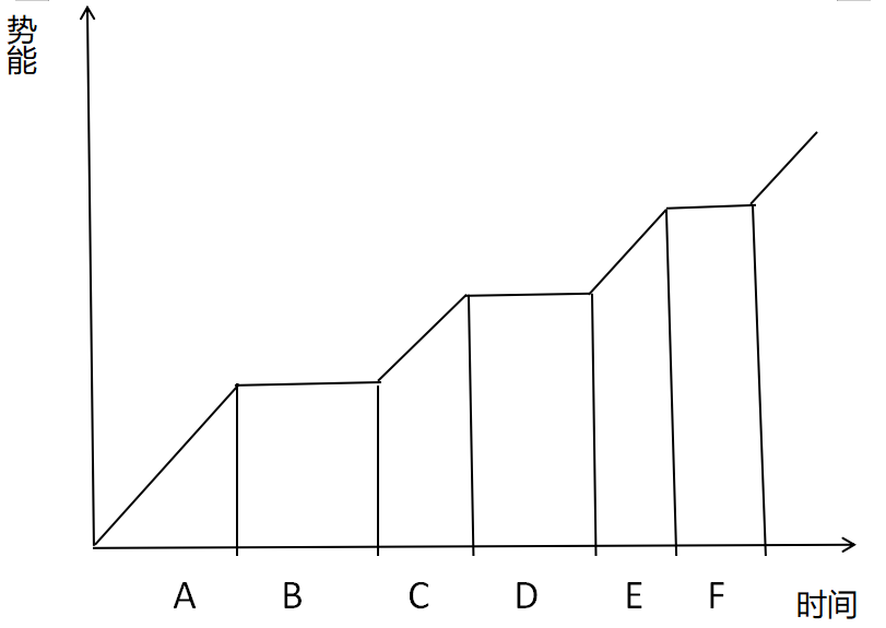 王老吉最初只是东南地区一种近似保健品的饮料,现在则是全国范围内的饮料品牌。这就是不断注入品牌势能的成果。品牌势能并不是像一条斜线自然向上延伸,而是有平稳期(如图BDF阶段)有上升期(如图ACE阶段)。
