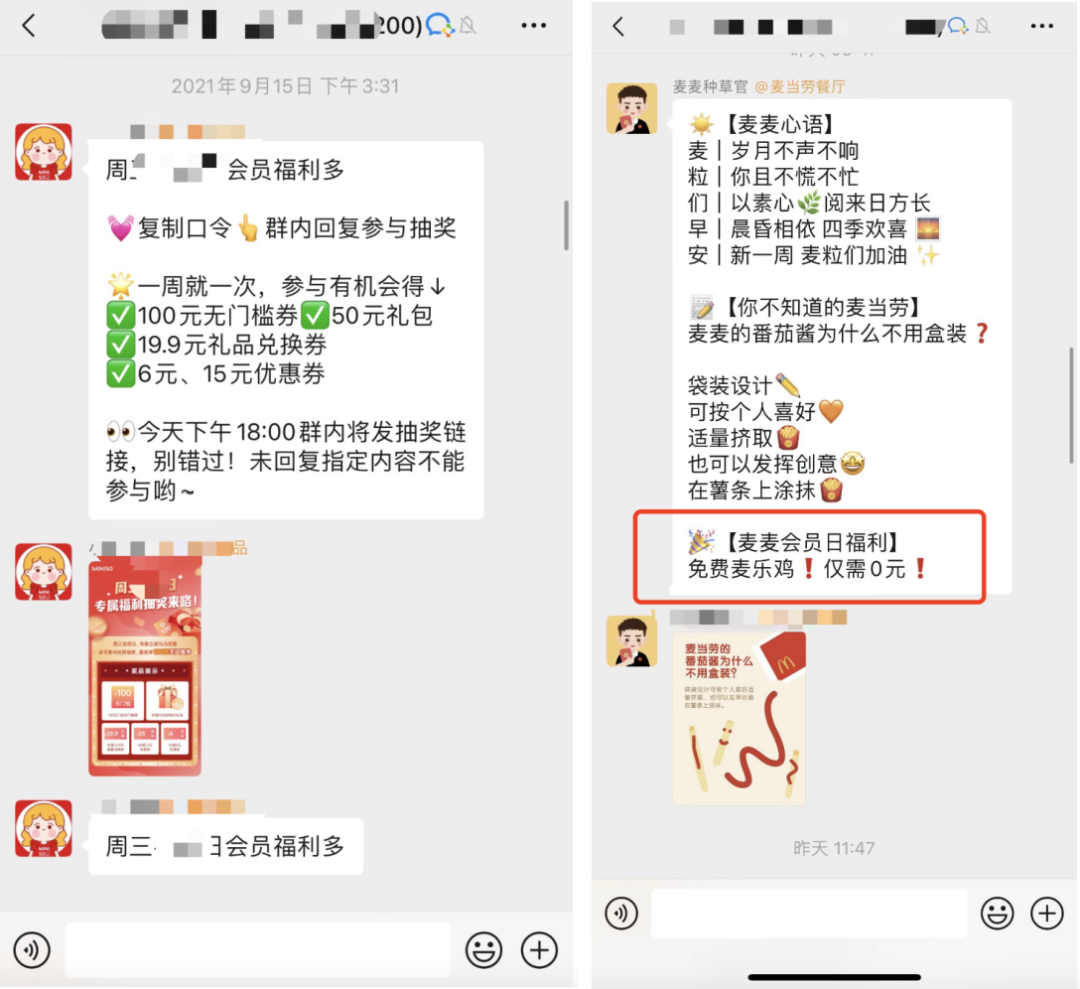 例如盒马每周三会员日,会进行直播、1元秒杀等促进转化的活动;名创优品就把每周三固定为社群会员日,会在社群中做抽奖。