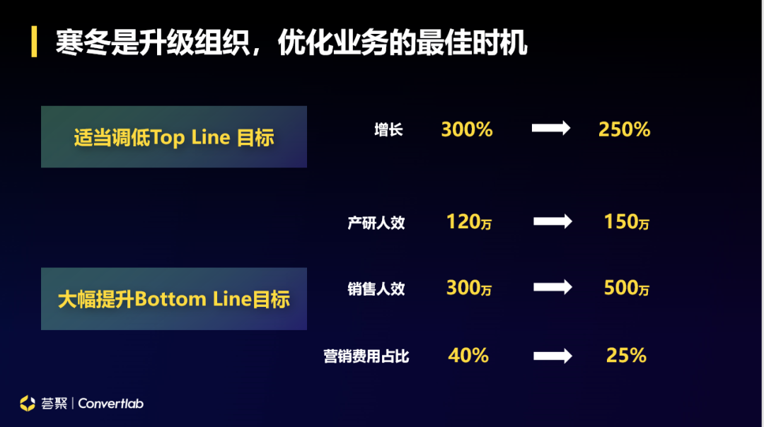 所以,首先我想告诉大家一个认知上的建议,在这样的一个大环境下,本身老板可能会给大家压力,因此我们要向内求,突破和优化Bottom Line。
