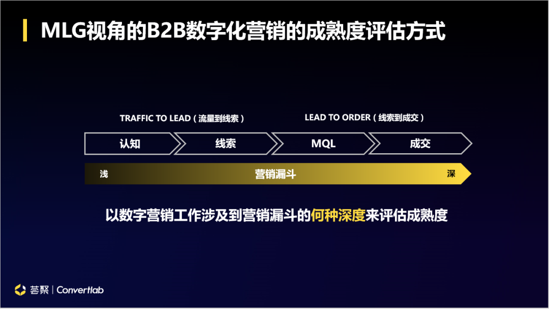 如何来评估自己的企业离MLG的差距呢,我们有一个评估模型,如果把市场工作按照一个潜客的生命周期分成认知到线索到MQL再到成交,你的市场工作在这个漏斗里面做的深浅,就代表了你的成熟度。