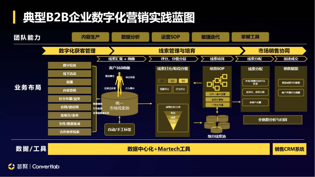 那这个时候就会关注到,市场怎么样去跟销售做配合,怎样去做精益化的运营,做潜客运营,以及把流程打通,这个时候就会带来一些挑战,对人、技术、工具,以及对内部协作的挑战。