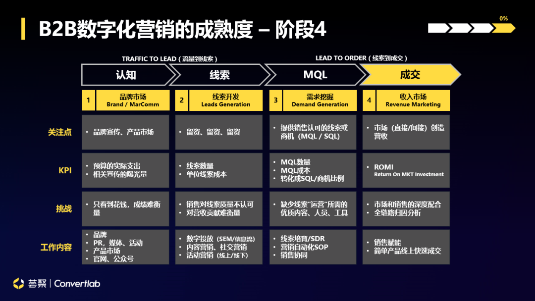 第四阶段是收入市场,我觉得revenue marketing在国内基本上还没有企业做到,这对于市场部内部的协同要求非常之高,也就是说市场部要能够看透整个营销后链路的数据和问题,要能够知道市场部供给的MQL,离开市场部到了销售甚至到了售后这个环节之后,是怎么被处理的,怎么被跟进的,有没有可能再进一步的优化,我市场部还能做什么,能不能再去提供支撑,这个对于内部协作的要求到了更深的层次,我觉得这是比较大的难点,这个阶段没有那么急,但是第三个阶段是一个关键的分水岭。