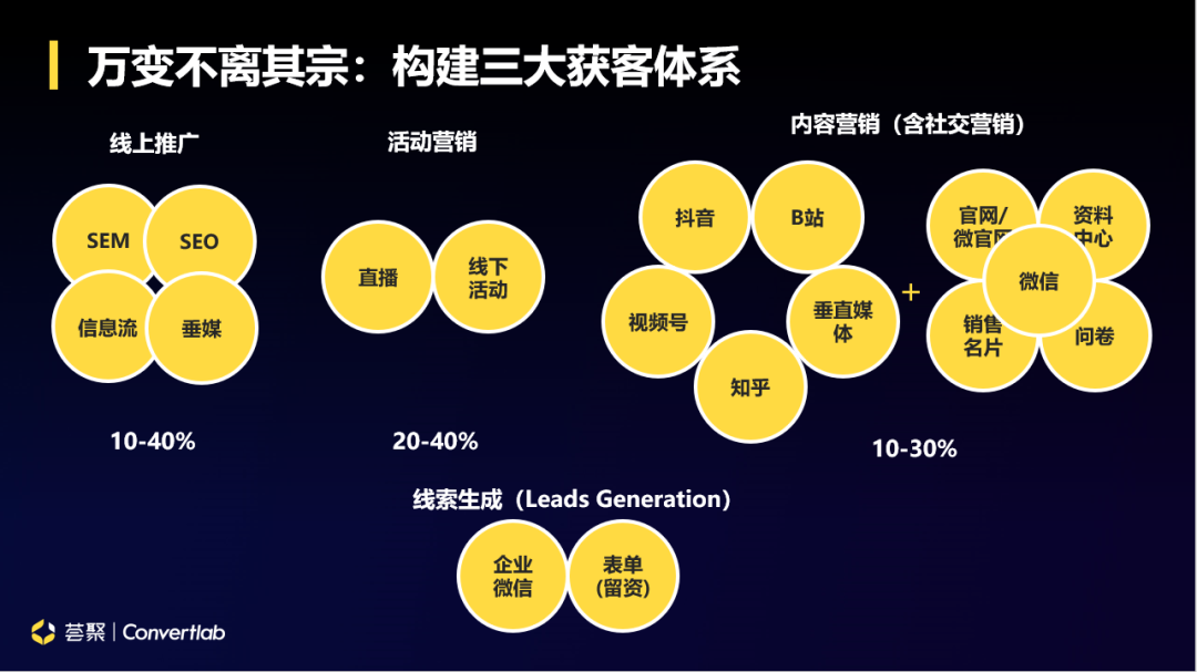 今天的获客手段越来越多,我也确实看到很多B2B客户在抖音和B站做营销,效果也挺好的,甚至是流量洼地,我觉得大家不用特别怵这个事情,可以去尝试,但是当你看到这么多眼花缭乱的获客场景,不要觉得乱成一团,它们依然没有跳出过三大核心框架(数字化推广、活动营销、内容营销),永远都是在这三个大的框架里面,只不过会有一些新的方式出现,但当你把新的方式放到这个框架里边,你就不会感到乱了。