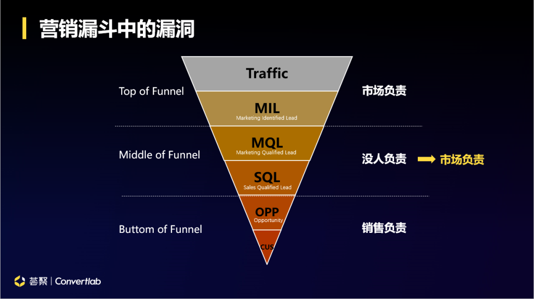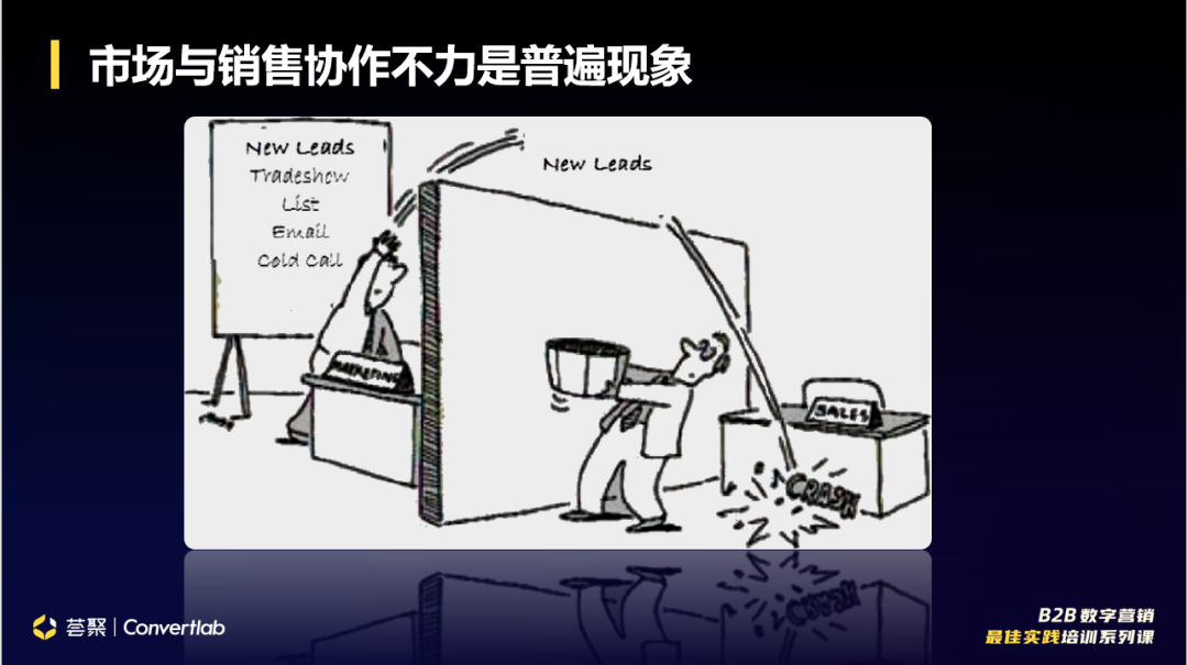 这个漫画描述的是市场把线索给到销售接,销售却接不住,就好像有一堵无形的墙挡在那里,其实是协作不好的问题,根本原因是营销漏斗出了问题。营销漏斗通常来讲分为上中下三端,市场部把上段管好,管到留资,然后销售把下段管好,但是销售只想从商机开始管,商机之前他就不愿意,他觉得你最好来一个线索就是商机,最好是下个月就要采购了,然后他就能直接去谈解决方案、谈价格了,所以中间这一段很多时候是没人管的,因此就会带来一个断层。