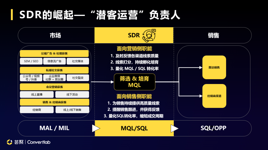 SDR是一个新的岗位,这个新的岗位是潜客运营,SDR在传统的市场和传统的销售工作中间,起到一个线索的管理、经营和衔接的作用。
