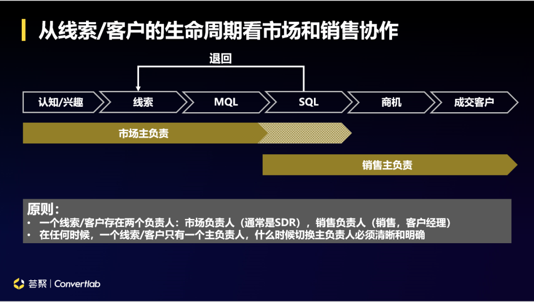 所以我们有两个原则,一个原则是每一个线索都有两个负责人,一个是市场部的负责人,一个是销售部的负责人,市场部的负责人是SDR,当然有些线索的周期很短,在市场部辨别之后就直接给销售了,但责任人还是可以指定一个SDR。另一个原则是,什么时候做主负责人切换要非常清晰。
