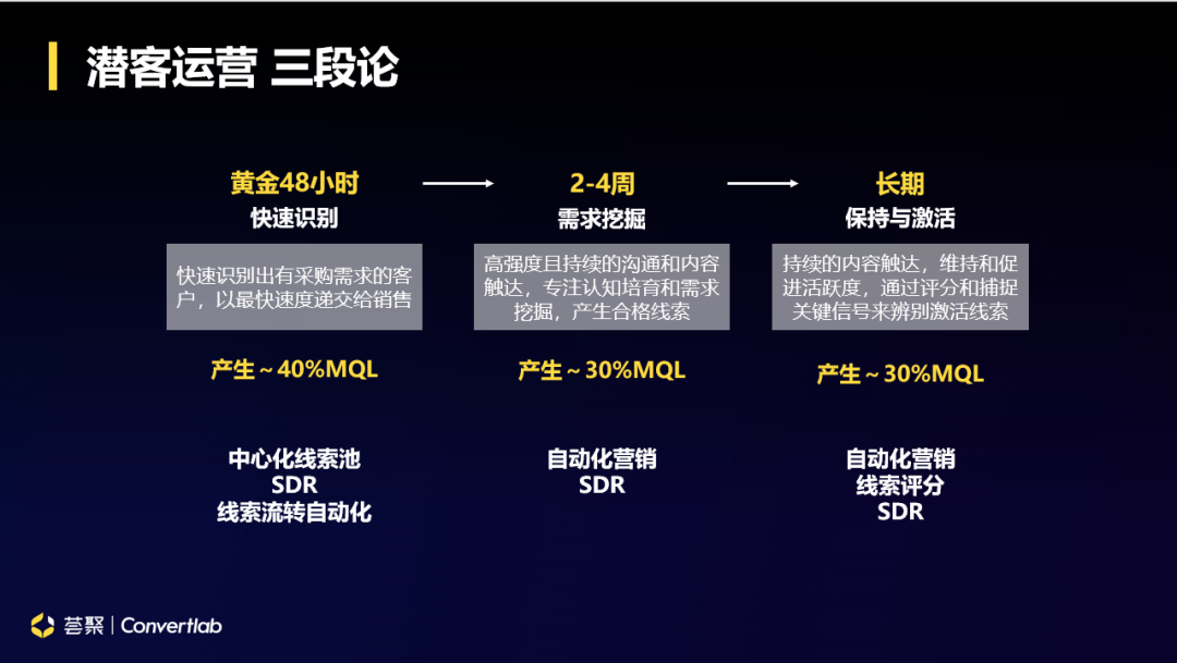 长期部分的线索他现在是没有采购需求的,但他是你的目标客户。他可能下半年、明年或者两年之后才会下单,那你应该怎么对待他呢?这个时候你必须要靠一些技术手段,因为我们并不想用低效的方式去经营这些长尾的线索池,所以我们用自动化营销+线索自动化评分机制+SDR的方式来共同完成这个阶段,大概30%的MQL会从这个阶段产生。