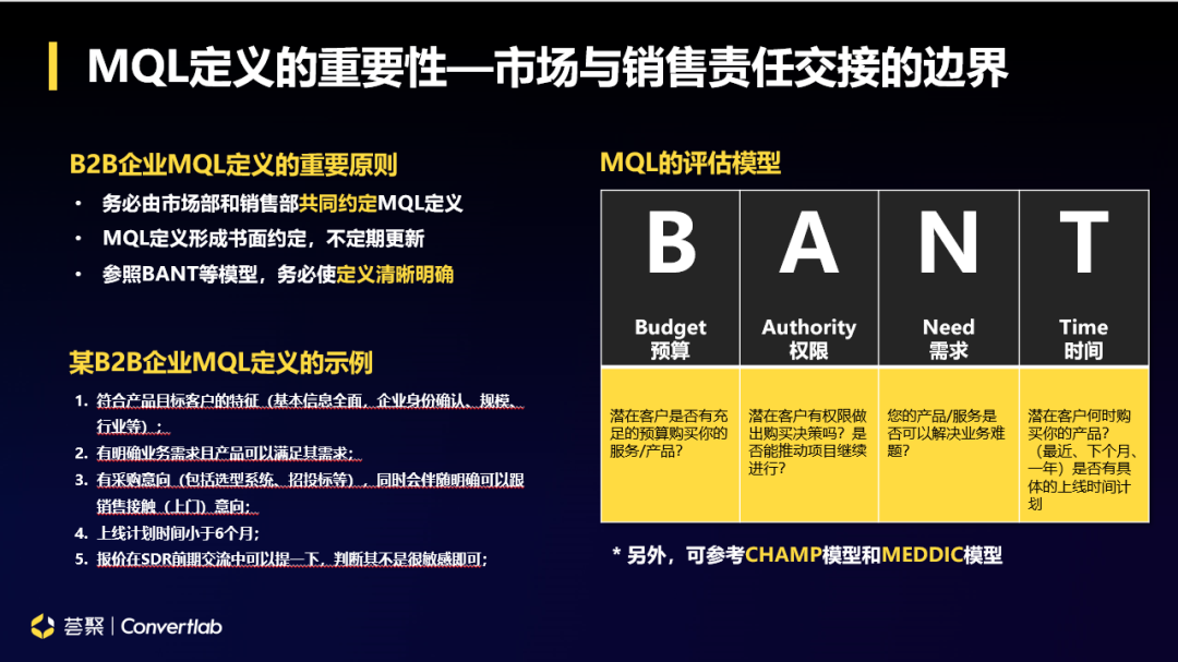 那么会建议用BANT这个模型来定义MQL,BANT是销售管理里面非常成熟的一个商机或者线索成熟度判断模型,从预算、权限、需求和时间四个维度去判断线索是否是MQL,有了这么一个定义之后,从流程协作来讲,就有了一个很好的基础。其中,有三个最重要的环节。