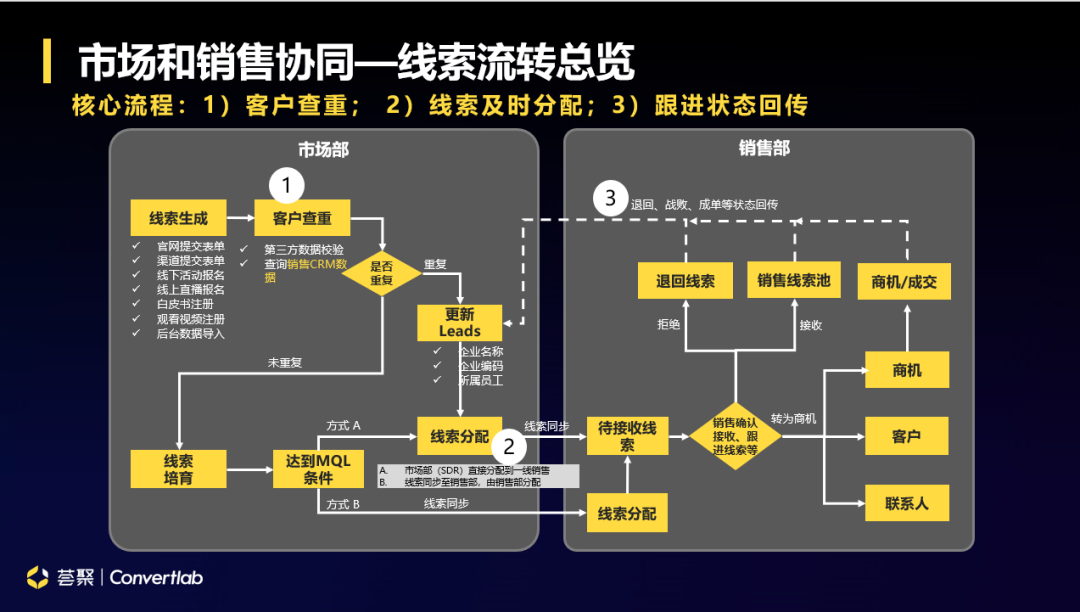 到了第三阶段就是市场和销售协同,我觉得可能也是MLG里面最关键的,没有协同,你的产出没有承接,线索会漏掉一大半。当然这整个流程并不是1-2-3,而是1-3-2,先做数字化获客管理,再做市场和销售协同,然后再来做线索管理与培育,线索管理与培育是更为精细化的。