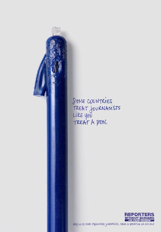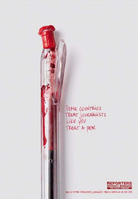 这个广告用被咬坏脑袋、摔碎“流血”的笔,表达出在很多国家记者是危险的,在最需要新闻之光的地方,很多记者无法正常工作,甚至被监禁、折磨、杀害。