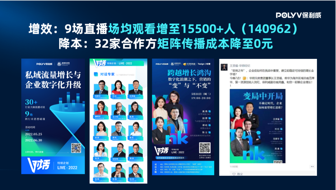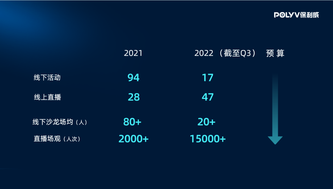 另外,直播还能够降低差旅成本。今年很多企业的预算都比较紧张,我们在做直播的时候,其实是能把我们往年一些线下沙龙的差旅成本,几乎是降到了0元。