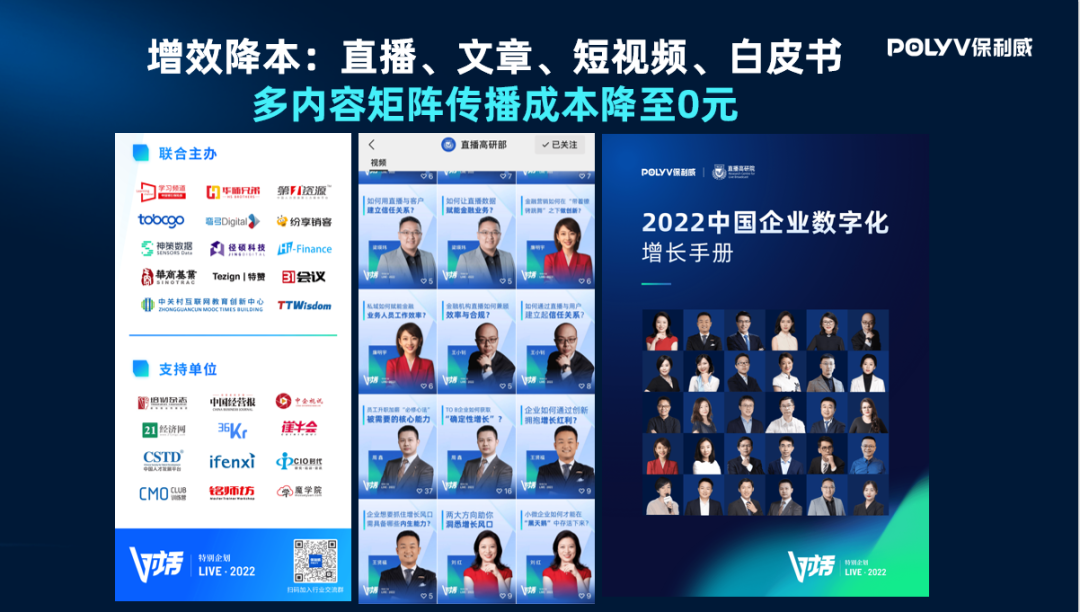 除此之外,在这个过程我们还会做很多文章、短视频的内容。比如为每场嘉宾剪辑2-3条的金句短视频,平均每一场直播就有了8-12条的视频内容产出,9场主题直播做完之后,我们把所有嘉宾的精华内容输出成册,整理成2022中国企业数字化增长手册。
