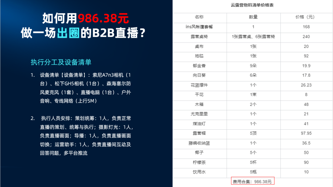 我们把当时实际付出的费用,做了一个清单列了出来,总共是986.38,包括露营的桌椅、布置的尤克里里、一些灯花等事项花费的费用,不过没有涵盖我们自己团队的成本,以及包括直播执行的费用。但是这场直播的影响力延续了很长时间,直播结束之后,从强哥这里又或是从我们的朋友圈等渠道,有很多人找到我们咨询直播服务。