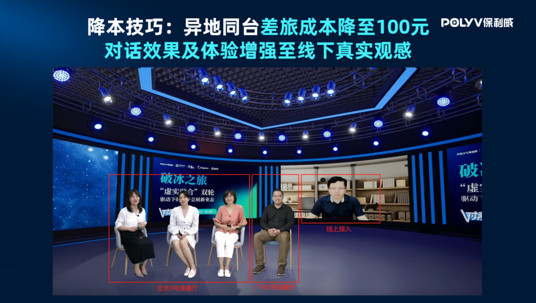 如果你想把这个画面做得更好,同时还有一些线下交流的部分,我们可以做成异地同台的方式。这场直播中的4位嘉宾,来自3个城市,但是呈现出的效果是四位坐着的嘉宾好像都来自一个城市,但其实有一位是来自广州,其他三位是在北京,但是你完全看不出他们其实是异地。这就是我们在整个业内独创的异地同台的方式,让整个对话的真实感变得更高了,这是目前在我们很多访谈直播以及发布会直播里面用得非常多的一种形式!