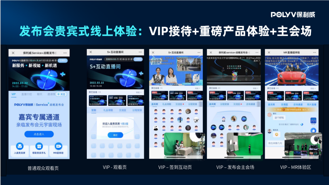 第二个是云坐席,这是由我们市场部去推进的一个产品功能,也是业内第一个把所有线下嘉宾和用户的坐席搬到线上的标杆。直播间里面会有嘉宾区、贵宾区和普通观众区, 增强交互感的同时还可以实现直播间社交,点击头像可以看到对方的信息,包括他的昵称、公司和岗位等等,还可以给他点赞,甚至加他的微信,这能让用户在直播间进行社交。非常适合我们发布会或B2B贵宾体验式的活动。