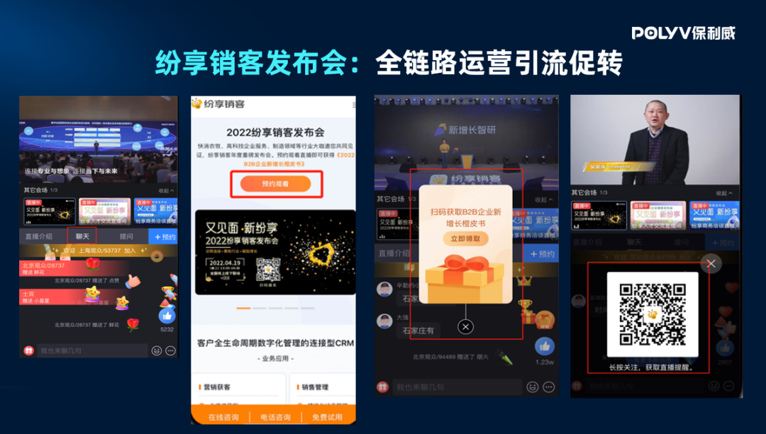 最常用的方式除了私域的传播,还有视频号的联播,通过生态、市场和我们合作方资源联动的方式,我们能够把整个直播的场观提升到过万以上的效果。这就是我们说的用直播去撬动生态联动。为什么不是用生态去撬动直播呢?